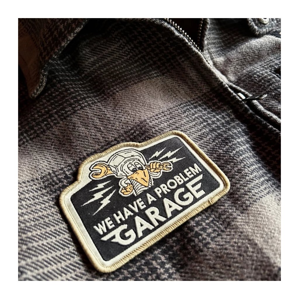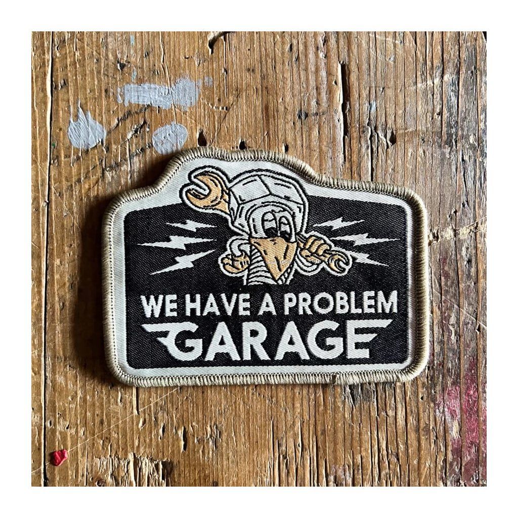 Originálna nažehľovacia nášivka Holyfreedom s motívom matice, kľúča a nápisu We Have a Problem Garage. Kvalitná tkanina s vyšívaným okrajom. Ideálny detail na vašu bundu, vestu alebo batoh. Rozmer 10 x 7 cm.